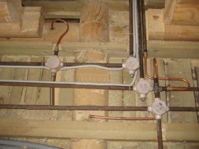 При монтаже скрытой прокладки кабеля в деревянном доме, кабель необходимо прокладывать в специальных металлических трубах. Заказчики часто обращаются с подобным вопросом в фирмы, и просят, чтобы кабель был проложен либо в гофре ПВХ, либо же открытым кабелем между деревянными брусками. Этого делать категорически нельзя, и все уважающие себя фирмы, отказывают заказчикам в этой просьбе.